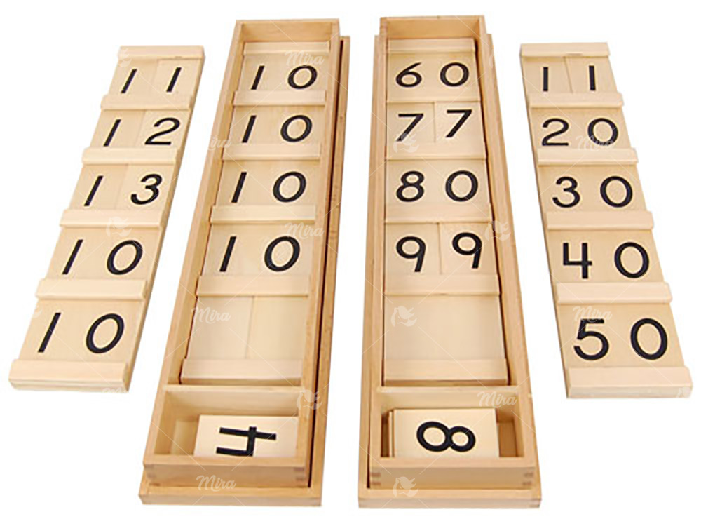 Bộ này bao gồm hai Bảng phân đoạn và chín thẻ số bằng gỗ có các chữ số 1-9.