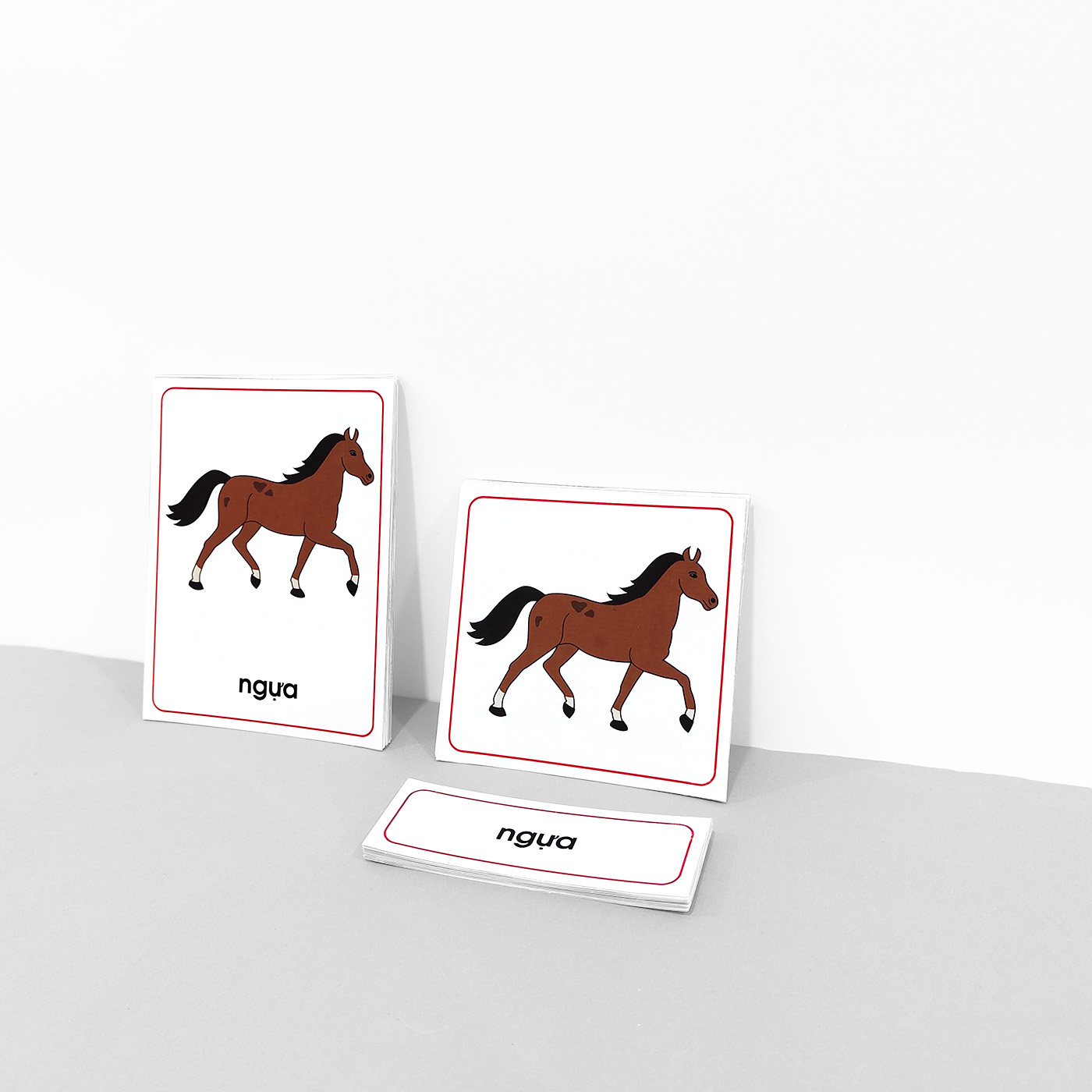 14 bộ thẻ 3 phần (42 thẻ), in màu trên giấy bìa, cán mờ